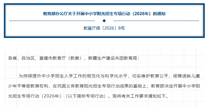 教育部开展中小学阳光招生专项行动!严禁提前招生、超计划招生、跨区域招生,严禁设立或变相设立重点班、实验班、快慢班!