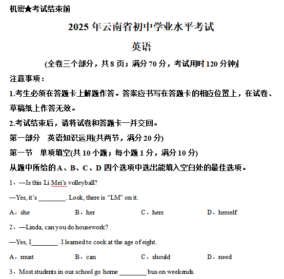25年云南中考英语试卷延续了四个部分、满分100分的结构,但在阅读理解考法和书面表达要求上出现了值得关注的新变化。
