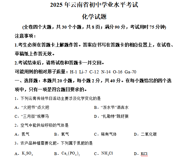 25年的化学试卷依据《2025云南省初中学业水平考试指导丛书》命题,延续了四个大题、20个小题的结构,满分50分(各地市可能略有差异),考试用时75分钟。